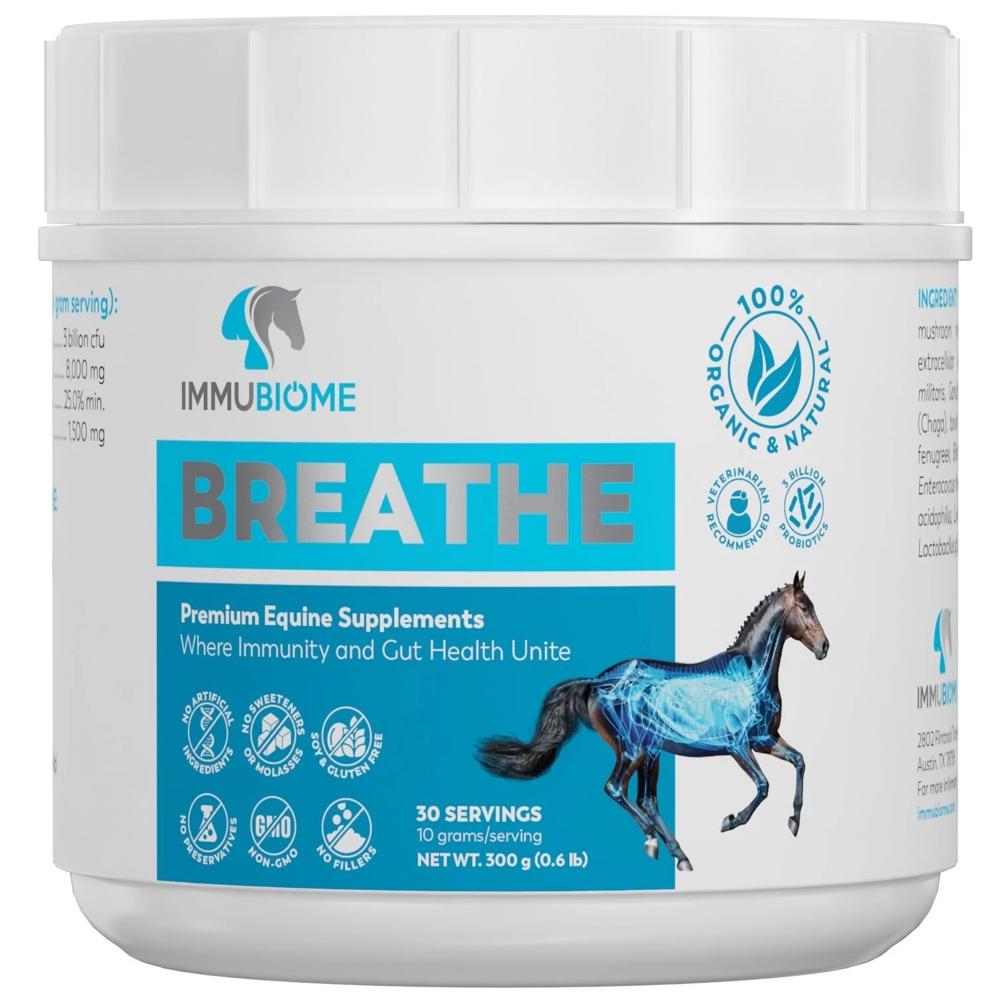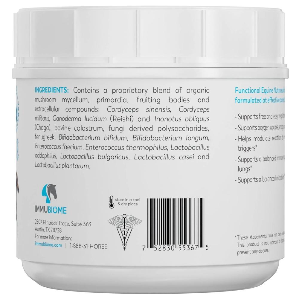 ImmuBiome Breathe is designed to support pulmonary function and is recommended for young horses and for horses suffering from respiratory ailments and allergies. Shown to increase oxygen capacity and improve airway health, the biochemical cordycepin from Cordyceps sinensis and a closely related species, Cordyceps militaris form the basis of this formulation. Medicinal mushroom preparations of Reishi and Chaga along with colostral fractions prime the equine pulmonary system to defend against environmental allergens and pathogenic invasion. Veterinarian recommended ImmuBiome Breathe encourages easy breathing for improved athletic ability, comfort and well-being.
