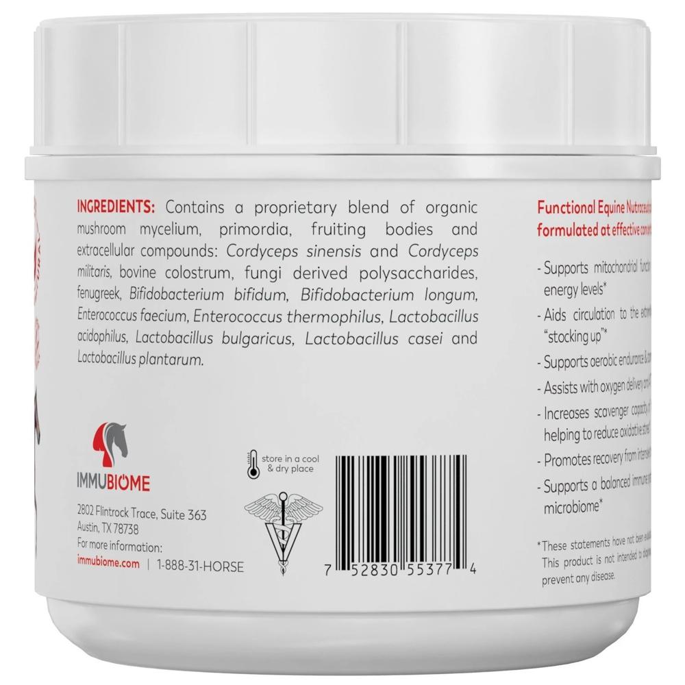 ImmuBiome Strength & Stamina is intended for high level equine athletes that need to build strength and endurance. A dynamic trio of Cordyceps preparations form the bulk of this formulation; organic full spectrum Cordyceps militaris, organic full spectrum Cordyceps sinensis, and potent Cordyceps sinensis polysaccharide extractives. The synergistic effect achieved by combining Cordyceps with the reparative bone building benefits of King trumpet, probiotics and bovine colostrum give equine athletes that extra push to go the distance. ImmuBiome Strength & Stamina - a racetrack favorite.