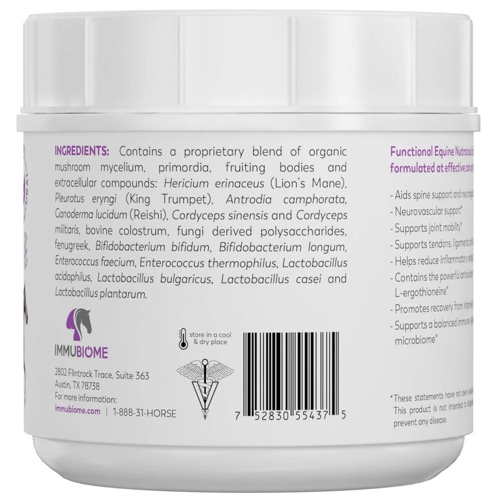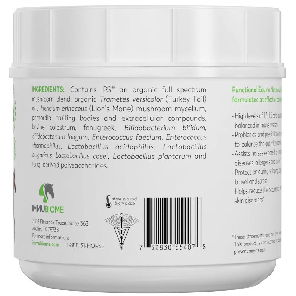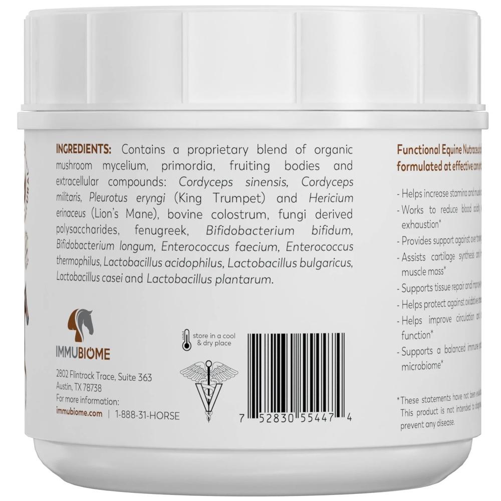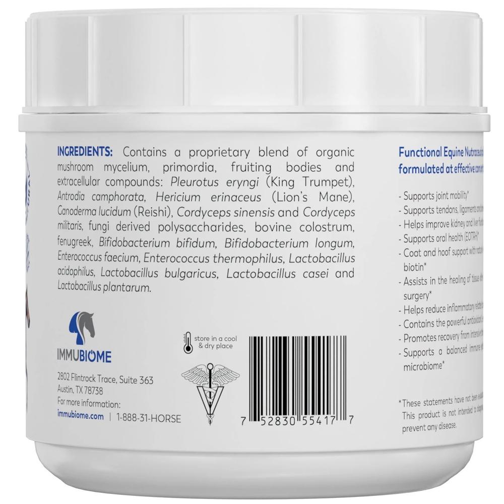 ImmuBiome Immune is designed to strengthen the equine natural defense system and is especially beneficial for horses with weakened or compromised immune systems. ImmuBiome Immune harnesses the potent array of bioactive compounds found in six remarkable full spectrum mushroom preparations (includes mycelium, primordia, fruit bodies and extracellular compounds) and combines them with the prebiotic, antioxidant rich mushroom mycelium of Turkey Tail and Lion’s Mane, probiotics and bovine colostrum for unmatched immune support.